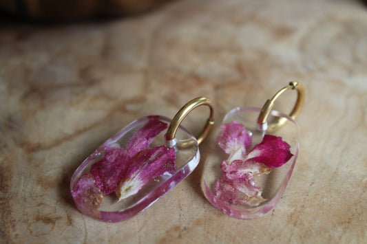 Boucles d’oreilles artisanales en acier inoxydable avec résine et fleurs séchées