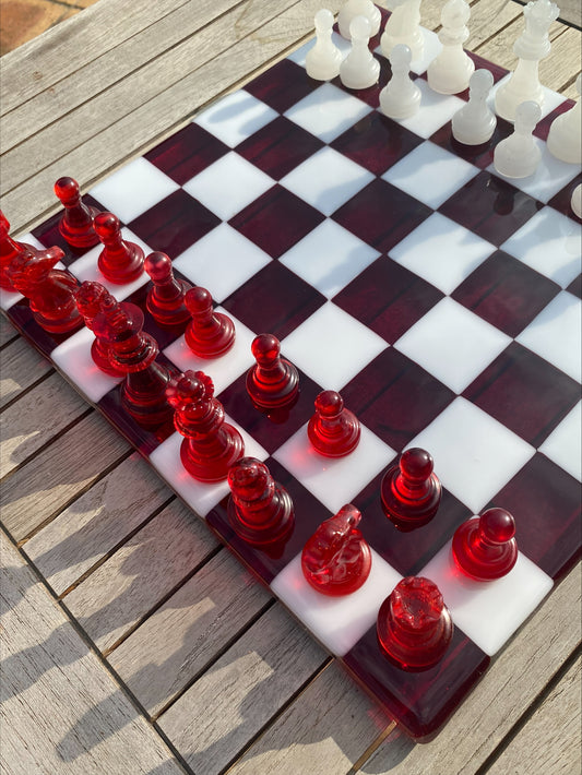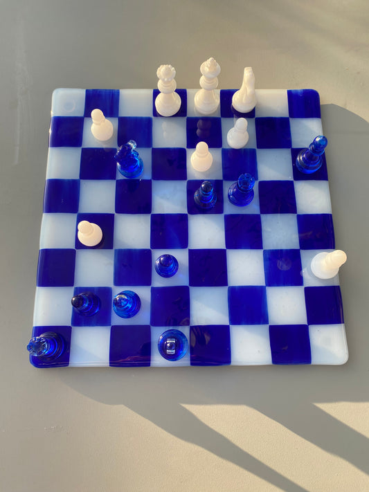 Echiquier artisanal en verre fusionné avec pièces en résine