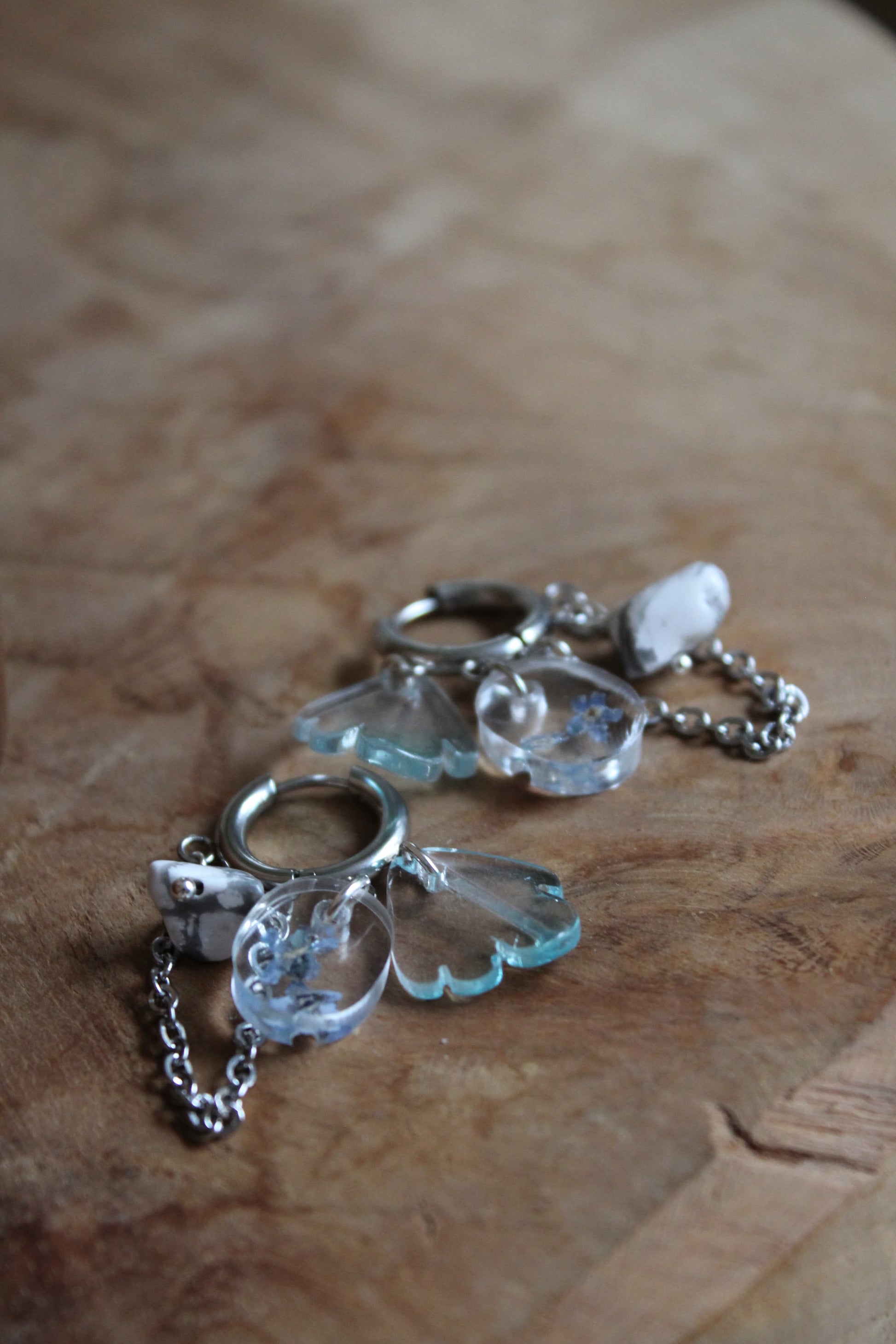 Ces boucles d'oreilles mettent en valeur une véritable fleur de myosotis soigneusement séchée et encapsulée dans de la résine transparente, associée à une pierre semi-précieuse authentique pour une touche de couleur et d’éclat naturel.