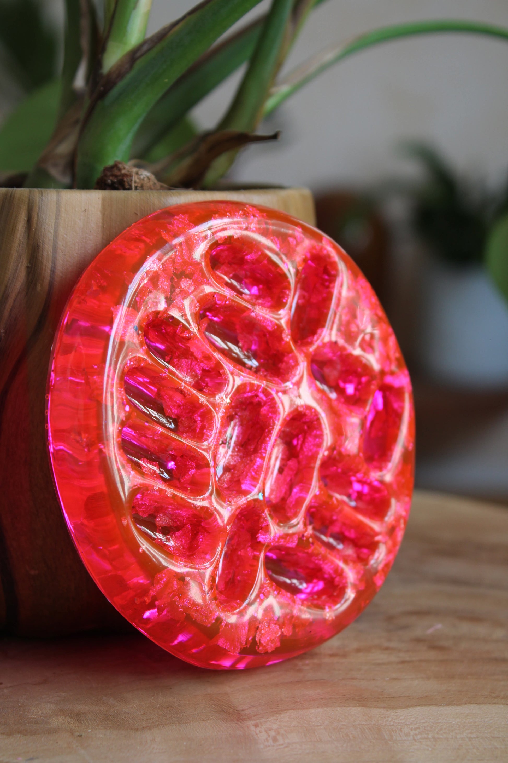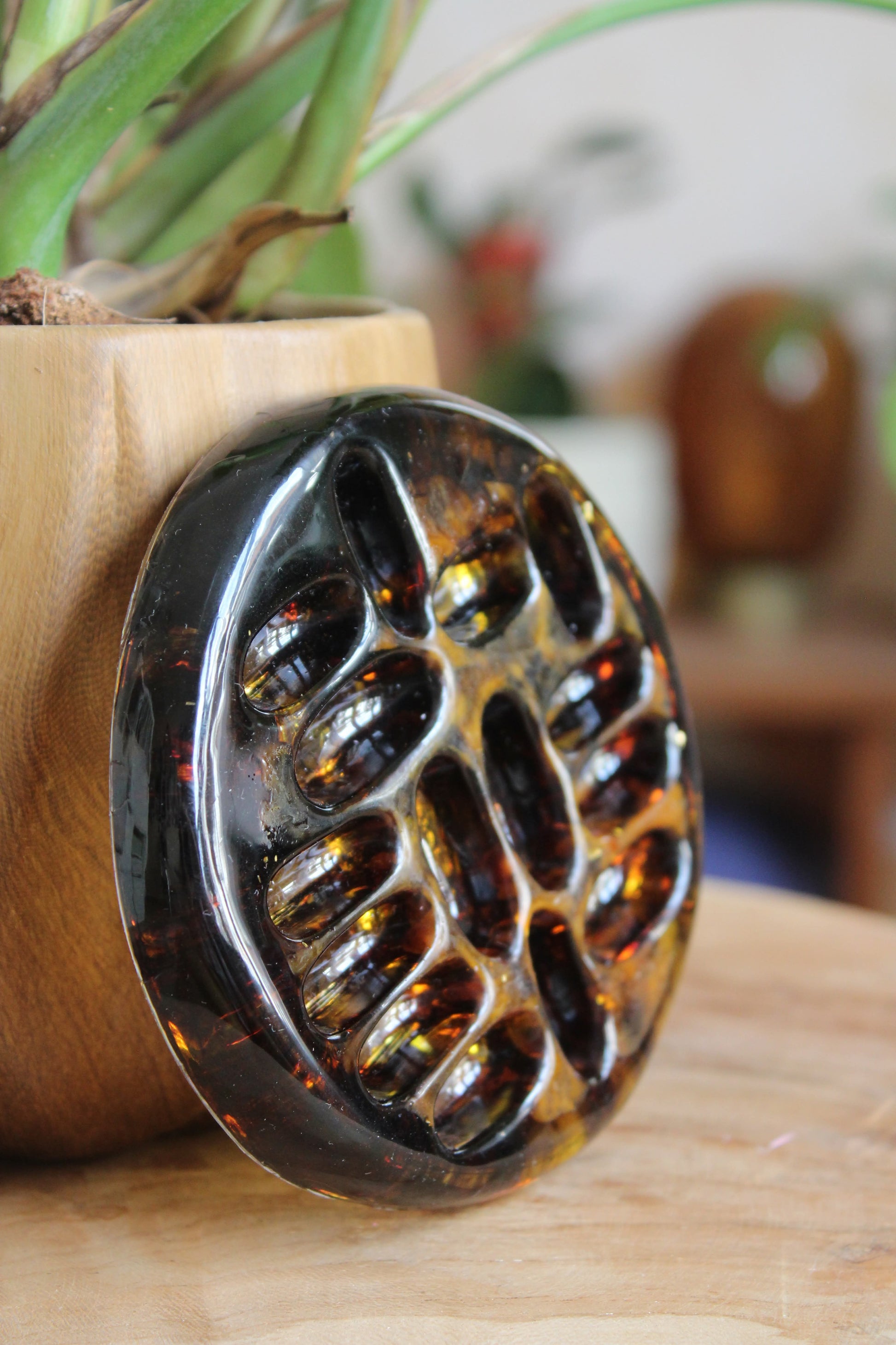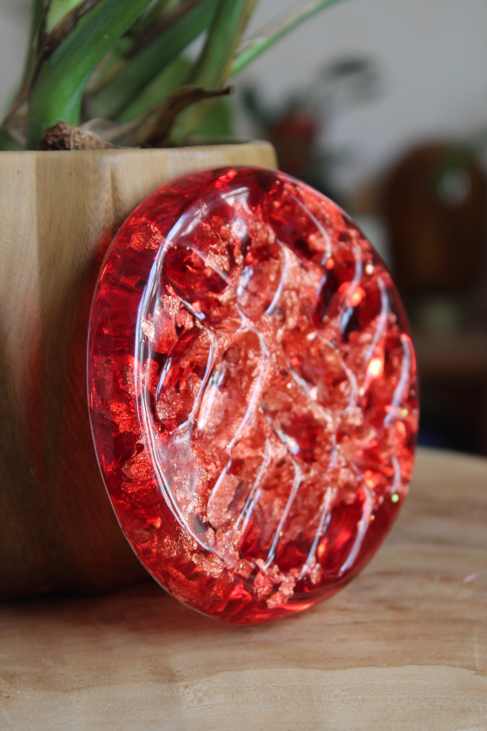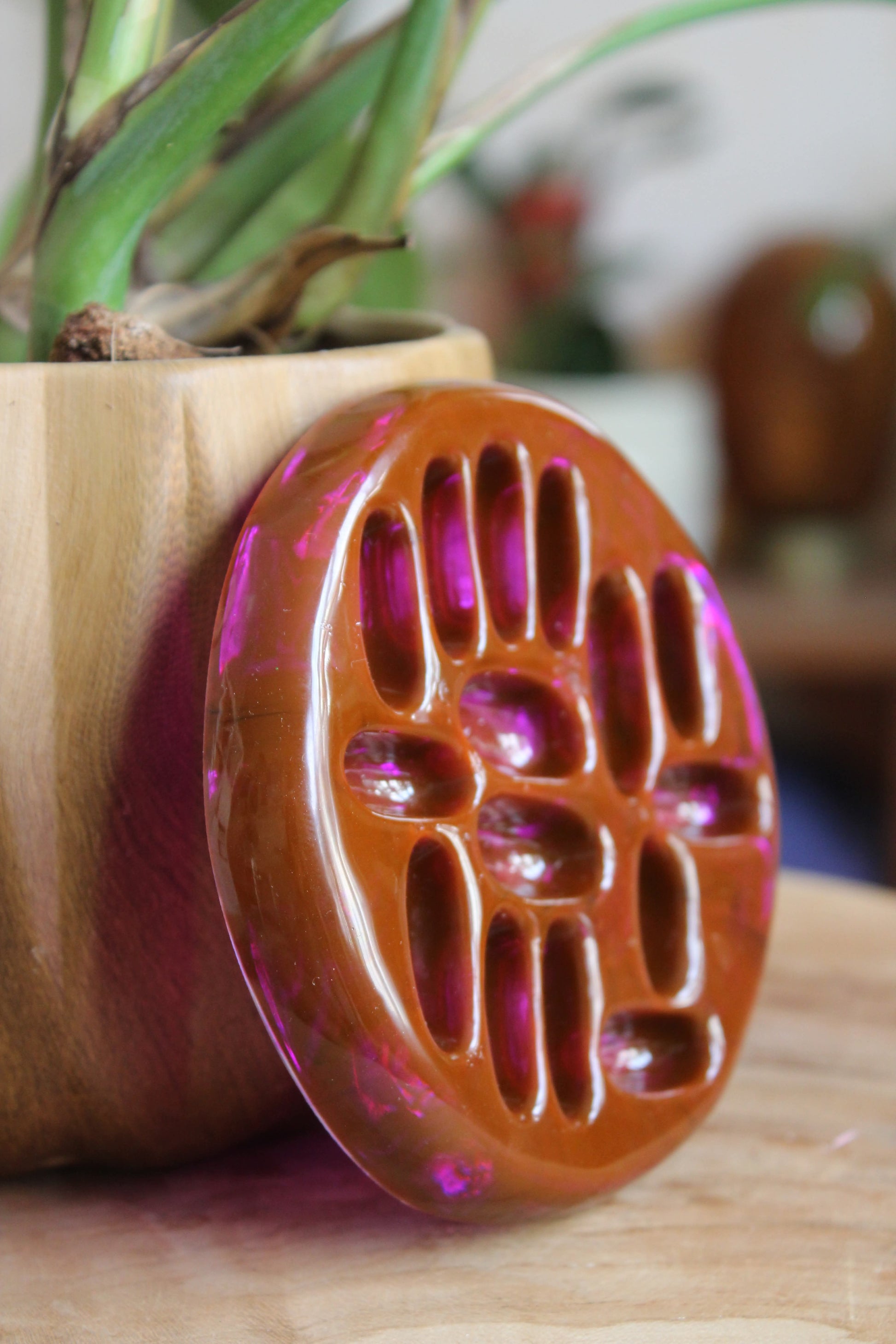 La coupelle à bijoux est un délicat objet décoratif et fonctionnel, réalisé en résine coulée à la main et colorée de pigments lumineux, parfois enrichie de fines feuilles métalliques (argent, cuivre) ou de paillettes. Inspirée par la forme d’une graine de lotus stylisée, elle offre une surface idéale pour déposer bagues, boucles d’oreilles, bracelet ou petits objets précieux.