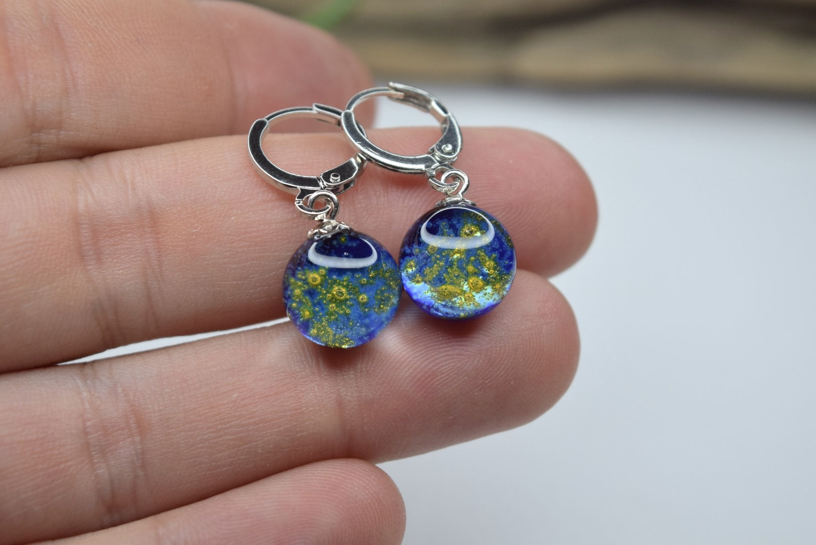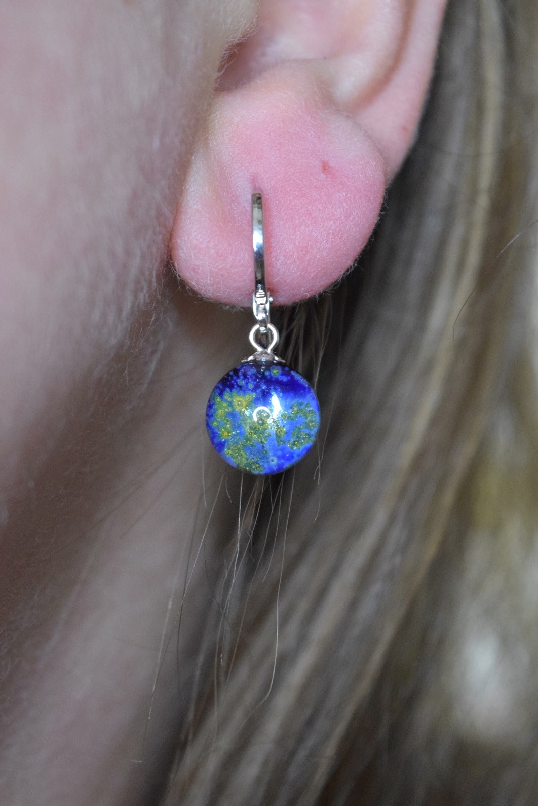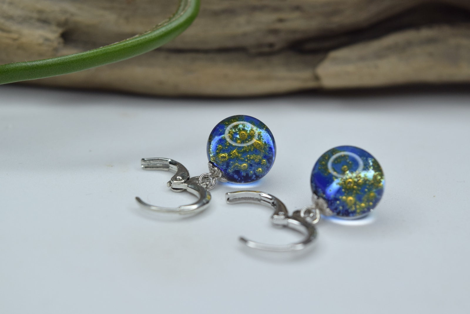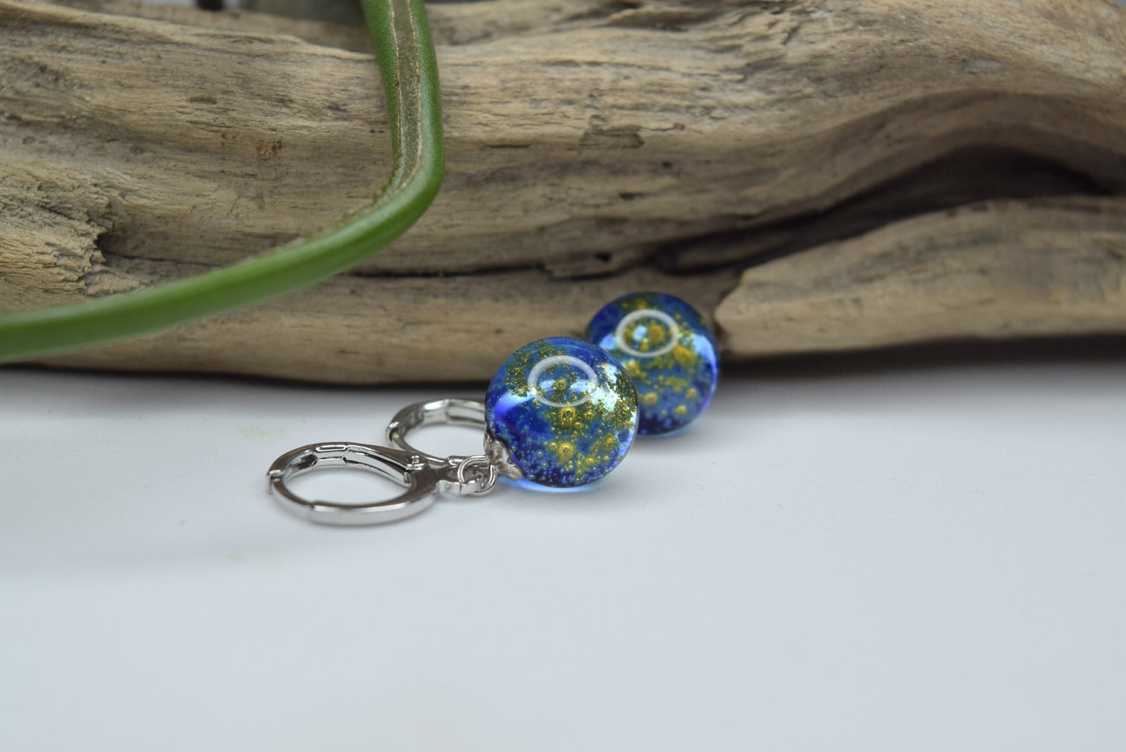 Ces créoles sont réalisées en verre borosilicate, avec une base bleu cobalt et poudre d’argent 999 incrustée.