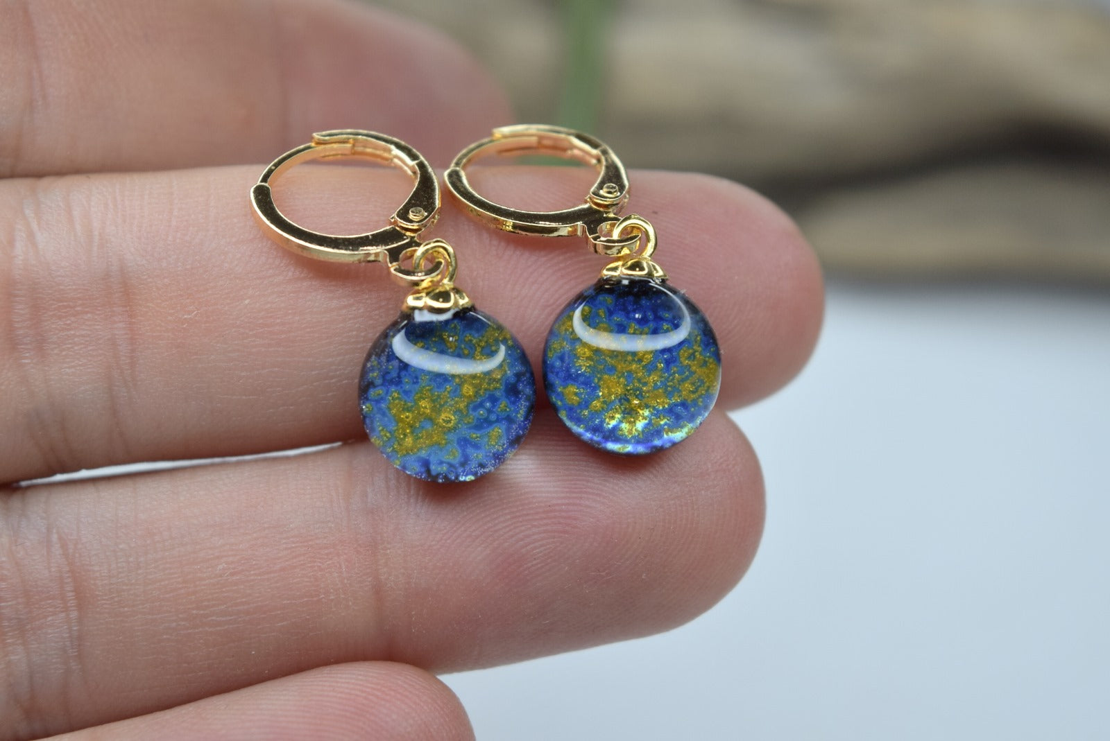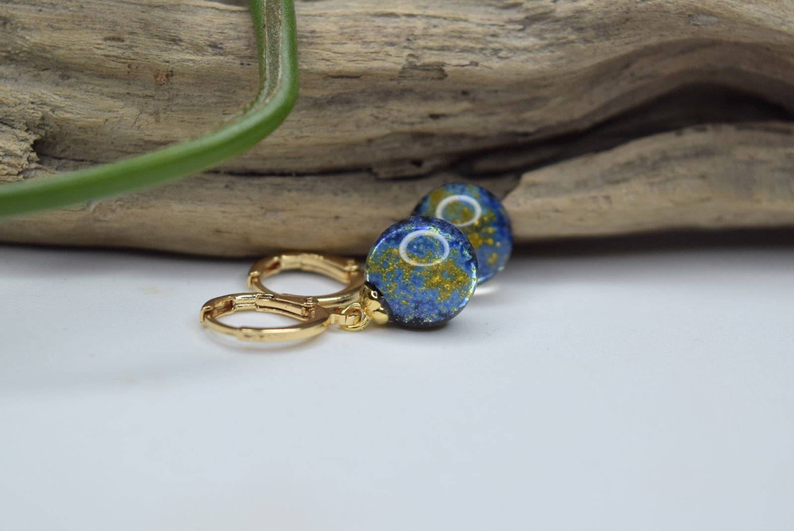 Ces créoles sont réalisées en verre borosilicate, avec une base bleu cobalt et poudre d’argent 999 incrustée.