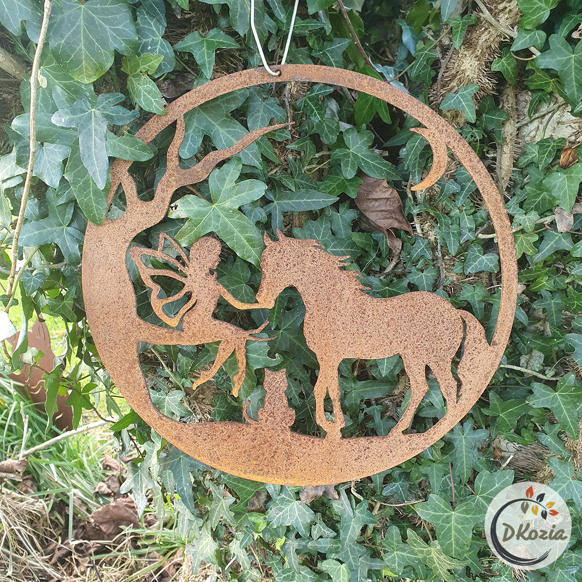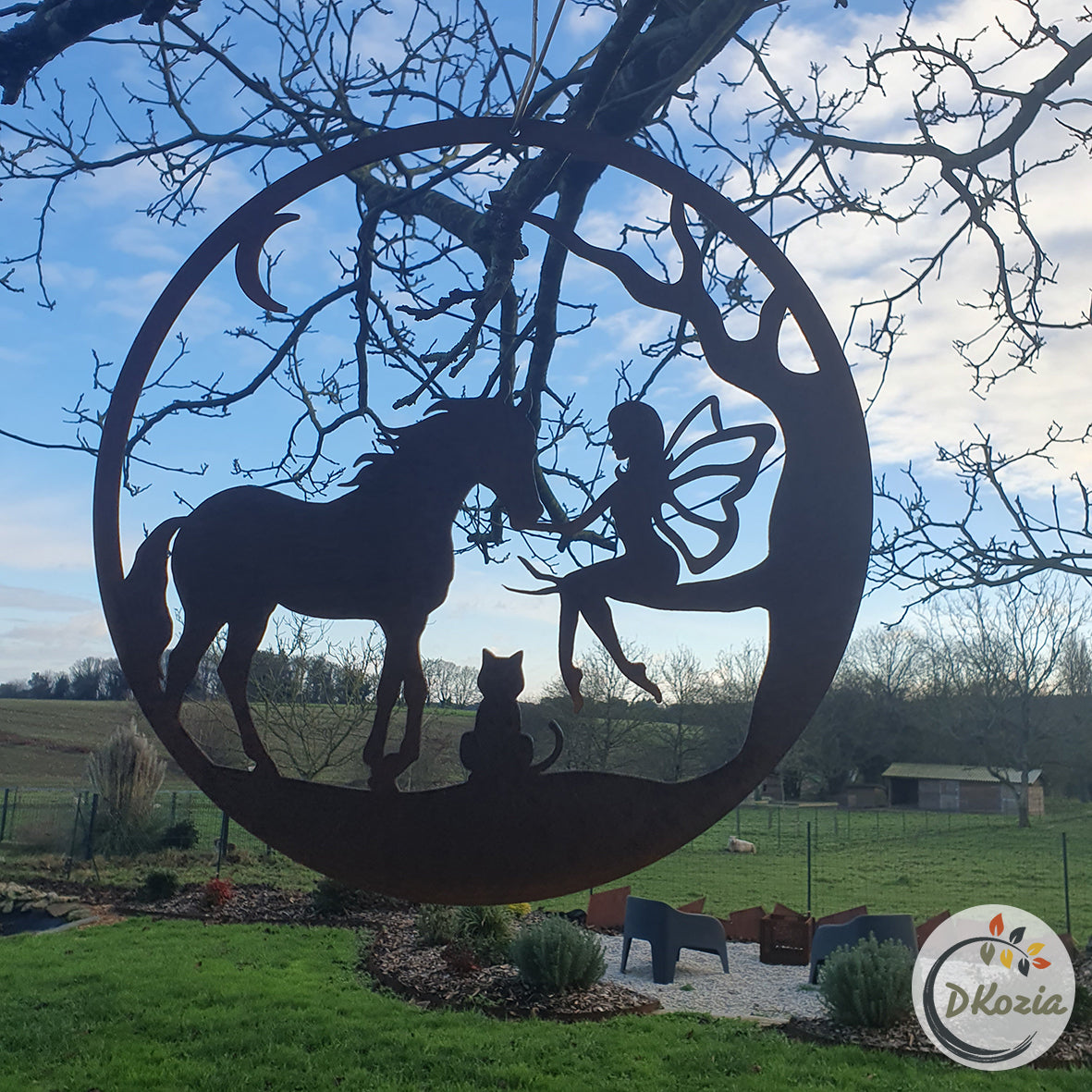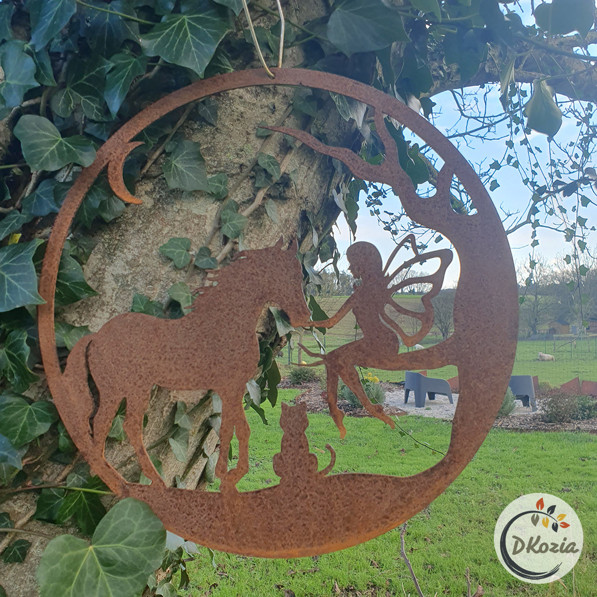 Un cercle enchanté s'installe dans votre jardin ! Notre suspension en acier Corten capture un moment de pure magie : la Fée, assise sur une branche, son fidèle Cheval et leur discret Chat, éclairés par un rayon de lune.